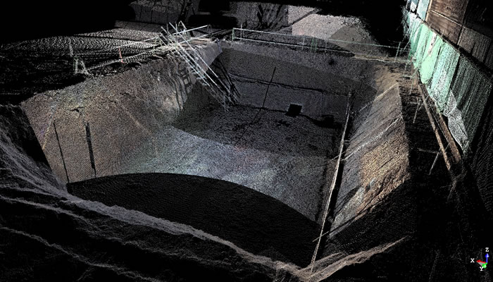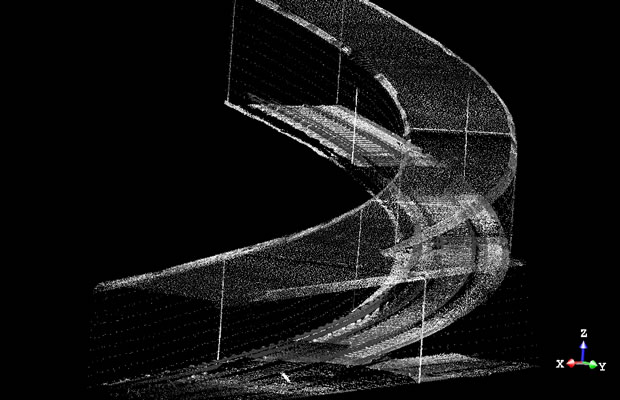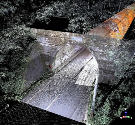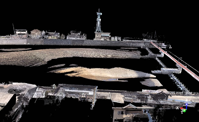 レーザスキャナーには航空機搭載型と地上型がありますが、精度や測点間の密度、急斜面地形への機動性やコストの面で、地上型レーザスキャナーが近年注目されています。当社の3次元レーザスキャナー(GS200モデル)は、測定対象物(地形や構造物など)から大量の測点を取得し、コンピュータ上でリアルタイムに面的形状を表示します。レーザスキャナーによる測量は一度だけ、横断の修正や構造物の建設などで、新に測量し直すことは基本的にはありません。危険地域での測量から解放され、短時間で高精度の成果品を作成できるため、測量と設計のコスト削減につながります。測量は今後、2次元から3次元のデジタル化へと進みます。また文化財・遺跡のデジタルアーカイブや図面化にも多く利用されています。